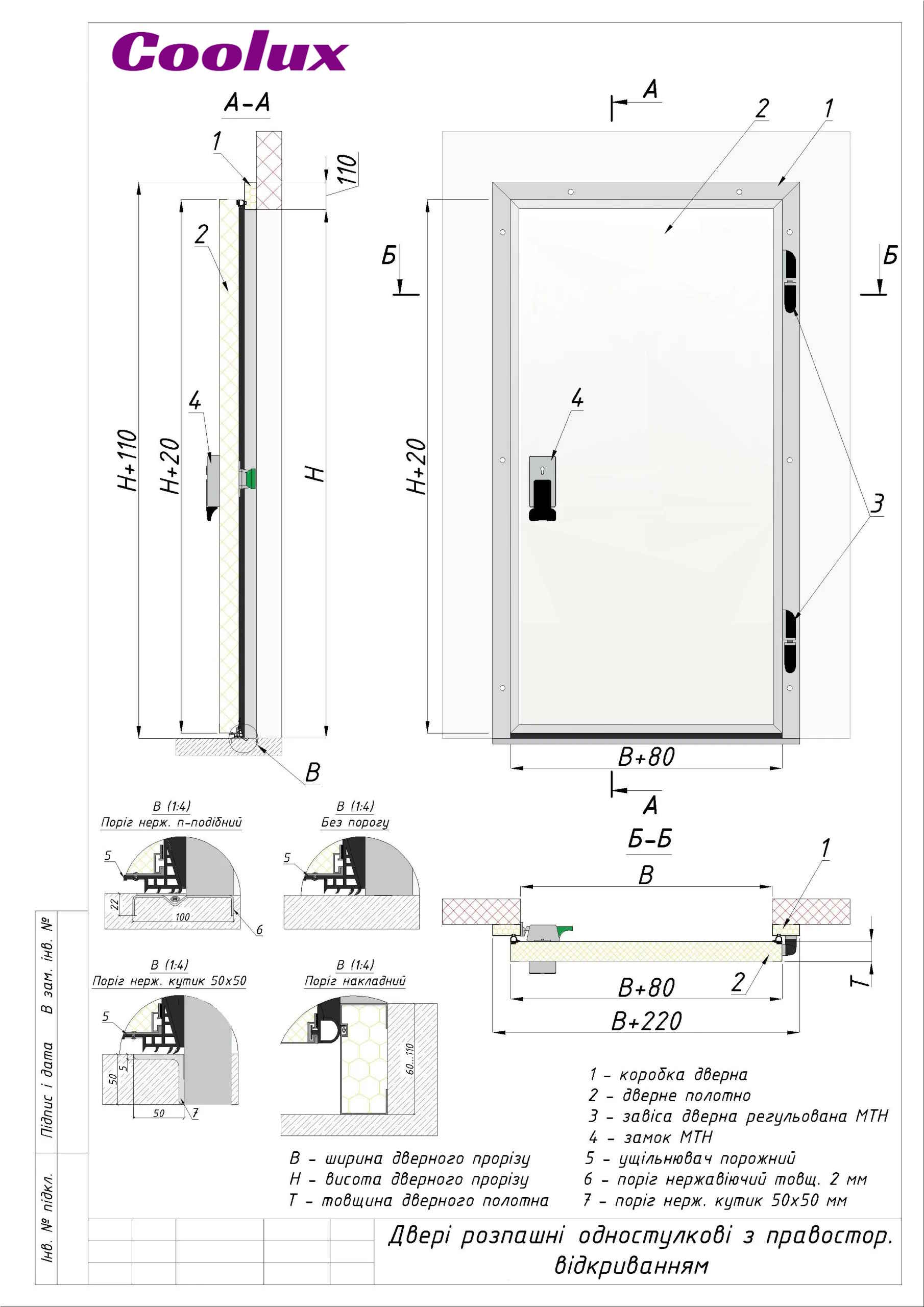 Двері морозильні розпашні ДМР100-НПЛ-1100-2000, замок праворуч, завіси ліворуч, накладний поріг, каб..