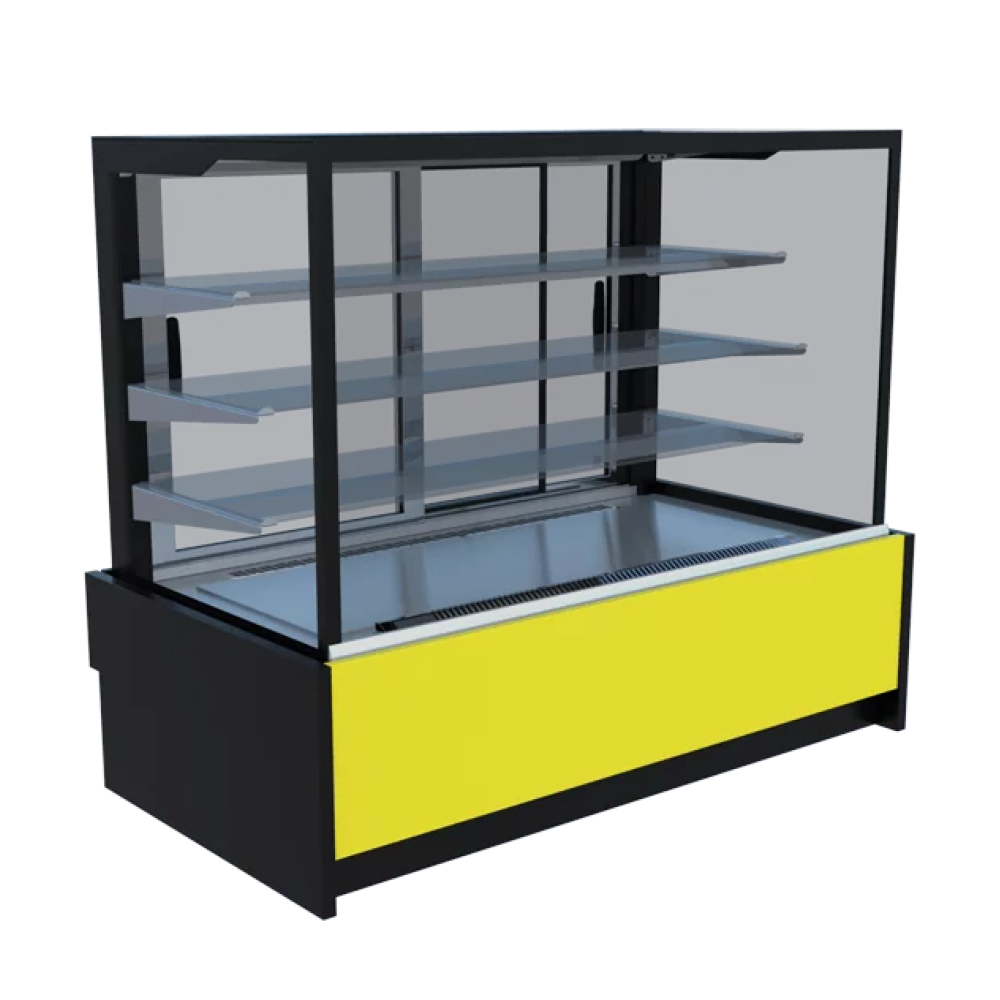 Вітрина кондитерська трендової кубічної форми з переднім прямим склом. Має подвійні загартовані склопакети.